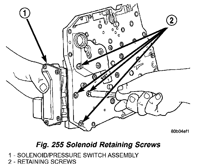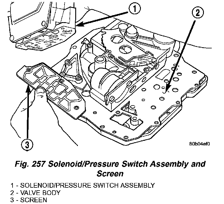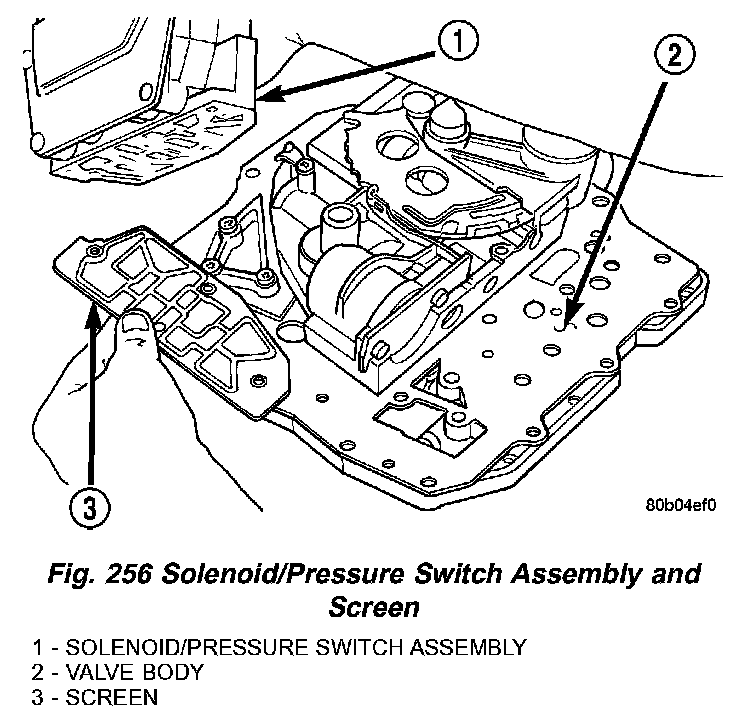 4. Remove Solenoid/Pressure Switch Assembly (1) and screen from valve body (2) (Fig. 256).