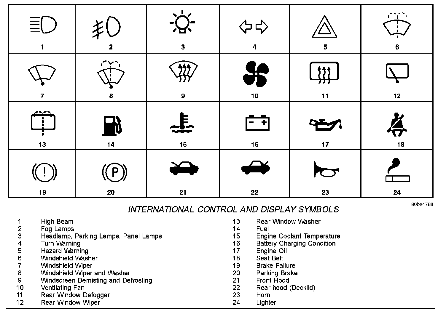 The graphic symbols illustrated in the following International Control and Display Symbols Chart are used to identify various instrument controls. The symbols correspond to the controls and displays that are located on the instrument panel.