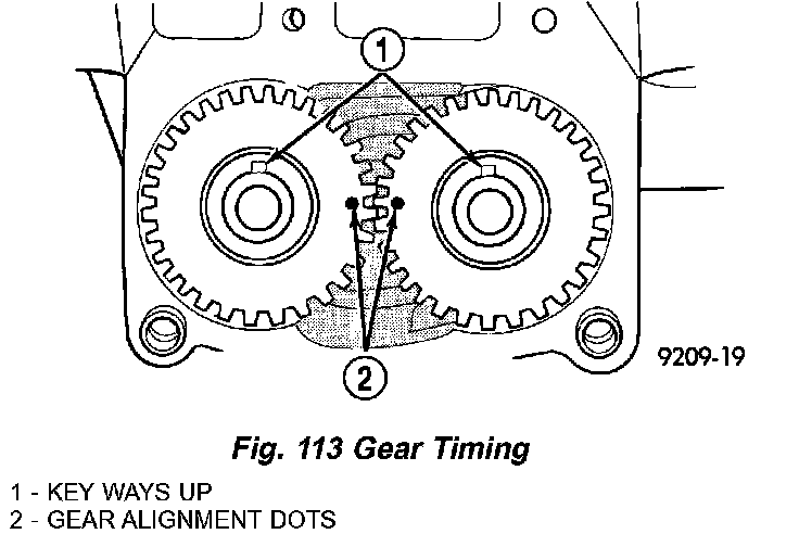 2. Turn balance shafts until both shaft key ways are up, parallel to vertical centerline of engine. Install short hub drive gear on sprocket driven shaft and long hub gear on gear driven shaft. After installation gear and balance shaft keyways must be up with gear timing marks meshed as shown in (Fig. 113).