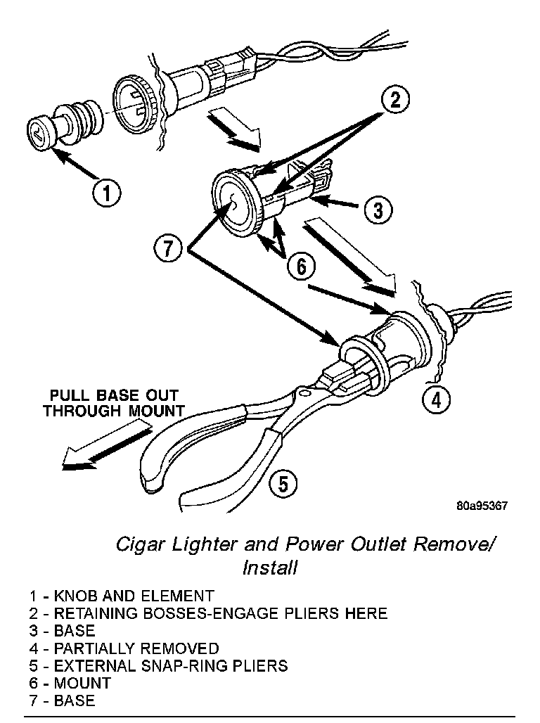 4. Insert a pair of external snap ring pliers into the cigar lighter or power outlet receptacle base and engage the tips of the pliers with the retaining bosses of the mount.