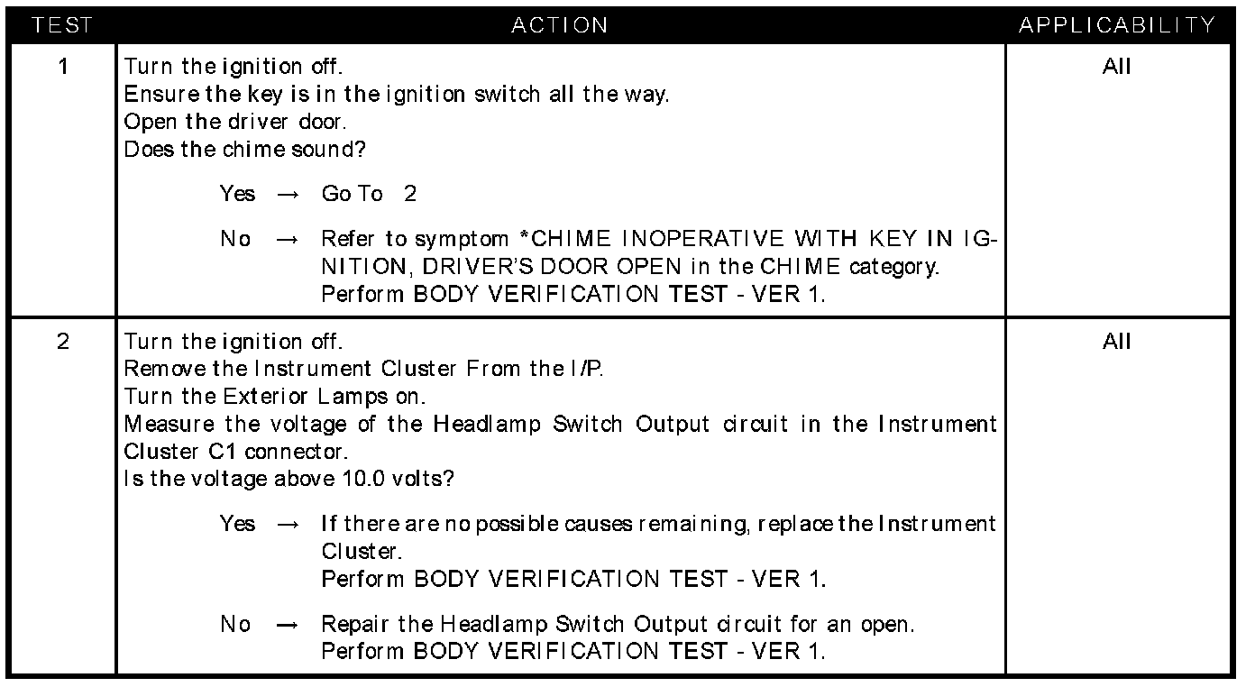 CHIME INOPERATIVE WITH EXTERIOR LAMPS ON AND DRIVER DOOR OPEN