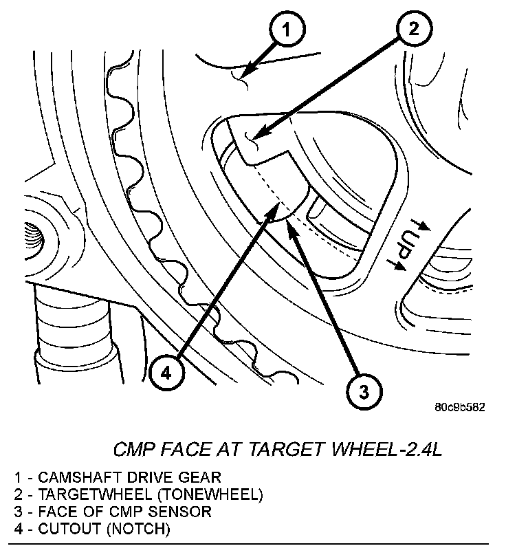 The Camshaft Position Sensor (CMP) sensor contains a hall effect device referred to as a sync signal generator. A rotating target wheel (tonewheel) for the CMP is located behind the exhaust valve-camshaft drive gear. The target wheel is equipped with a cutout (notch) around 180 degrees of the wheel. The CMP detects this cutout every 180 degrees of camshaft gear rotation. Its signal is used in conjunction with the Crankshaft Position Sensor (CKP) to differentiate between fuel injection and spark events. It is also used to synchronize the fuel injectors with their respective cylinders.