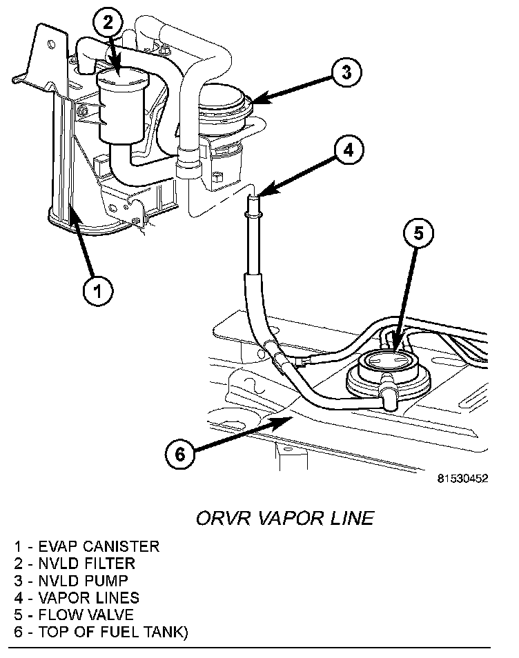 4. A vapor line (4) connects the fuel tank to the EVAP canister and NVLD pump. This connection is made near the right/rear corner of the fuel tank. Carefully disconnect this line. Be very careful not to bend or kink the vapor lines. If lines leak, a Diagnostic Trouble Code (DTC) will be set.