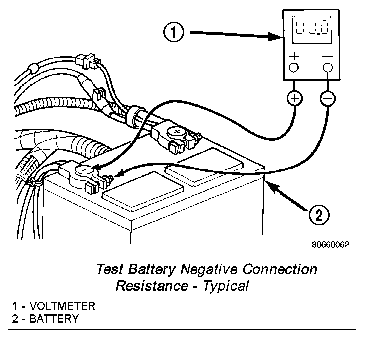 1. Connect the positive lead of the voltmeter to the battery negative terminal post. Connect the negative lead of the voltmeter to the battery negative cable terminal clamp. Rotate and hold the ignition switch in the Start position. Observe the voltmeter. If voltage is detected, correct the poor connection between the battery negative cable terminal clamp and the battery negative terminal post.