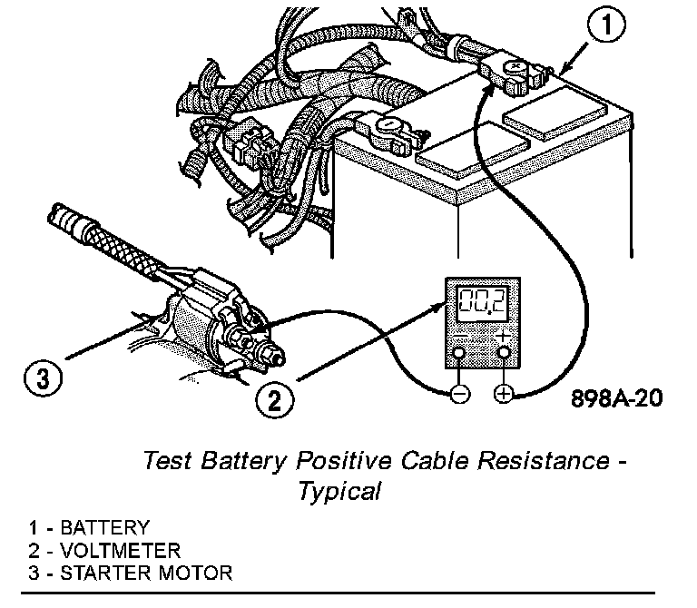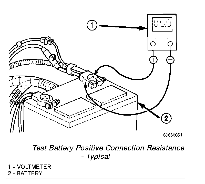 When performing the voltage drop test, it is important to remember that the voltage drop is giving an indication of the resistance between the two points at which the voltmeter probes are attached. EXAMPLE: When testing the resistance of the battery positive cable, touch the voltmeter leads to the battery positive cable terminal clamp and to the battery positive cable eyelet terminal at the starter solenoid B(+) terminal stud. If you probe the battery positive terminal post and the battery positive cable eyelet terminal at the starter solenoid B(+) terminal stud, you are reading the combined voltage drop in the battery positive cable terminal clamp-to-terminal post connection and the battery positive cable.