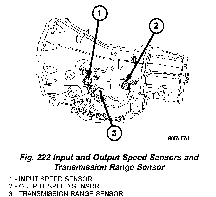 The Input and Output Speed Sensors (Fig. 222) are two-wire magnetic pickup devices that generate AC signals as rotation occurs. They are mounted in the left side of the transmission case and are considered primary inputs to the Transmission Control Module (TCM).