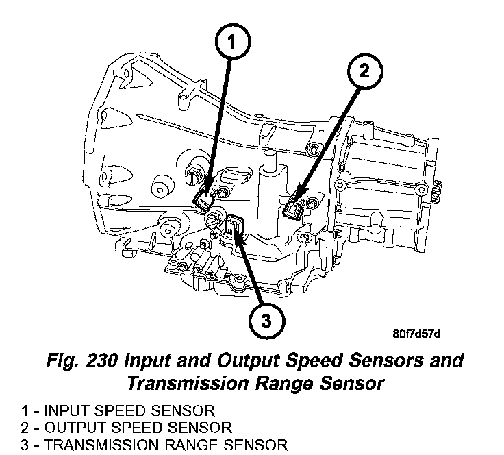 The Input and Output Speed Sensors (Fig. 230) are two-wire magnetic pickup devices that generate AC signals as rotation occurs. They are mounted in the left side of the transmission case and are considered primary inputs to the Transmission Control Module (TCM).