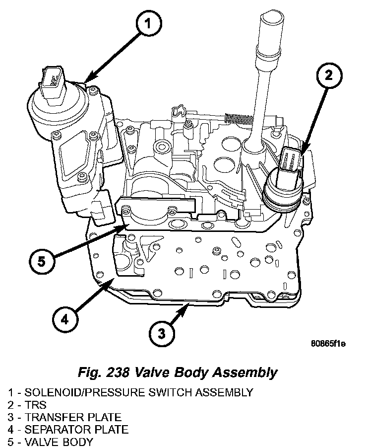 The Solenoid/Pressure Switch Assembly (1) (Fig. 238) is inside the transmission and mounted to the valve body assembly The assembly consists of four solenoids that control hydraulic pressure to the L/R, 2/4, OD, and UD friction elements (transmission clutches), and the torque converter clutch. The reverse clutch is controlled by line pressure from the manual valve in the valve body The solenoids are contained within the Solenoid/Pressure Switch Assembly, and can only be serviced by replacing the assembly