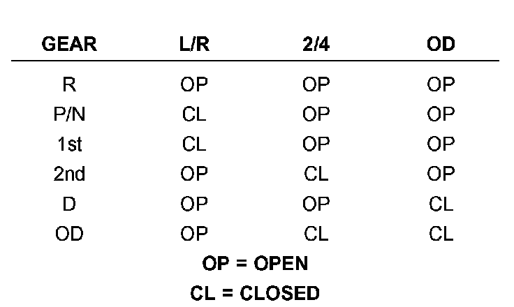 The TCM relies on three pressure switches to monitor fluid pressure in the L/R, 2/4, and OD hydraulic circuits. The primary purpose of these switches is to help the TCM detect when clutch circuit hydraulic failures occur. The range for the pressure switch closing and opening points is 11-23 psi. Typically the switch opening point will be approximately one psi lower than the closing point. For example, a switch may close at 18 psi and open at 17 psi. The switches are continuously monitored by the TCM for the correct states (open or closed) in each gear as shown in the chart: