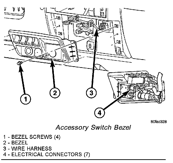 3. Remove the four screws that secure the accessory switch bezel to the instrument panel.