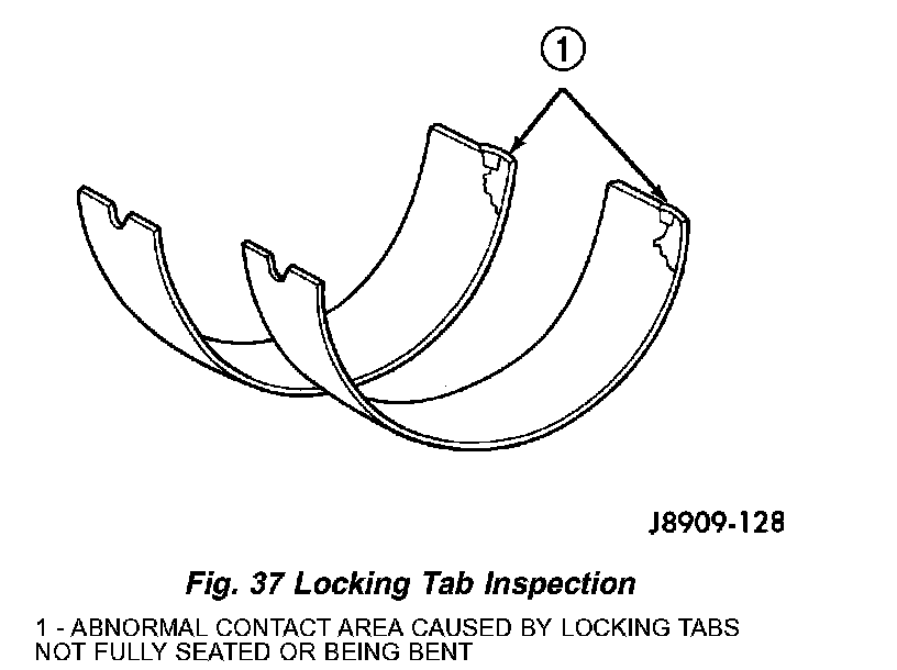 Inspect the connecting rod bearings for scoring and bent alignment tabs (Fig. 36) (Fig. 37). Check the bearings for normal wear patterns, scoring, grooving, fatigue and pitting (Fig. 38). Replace any bearing that shows abnormal wear.