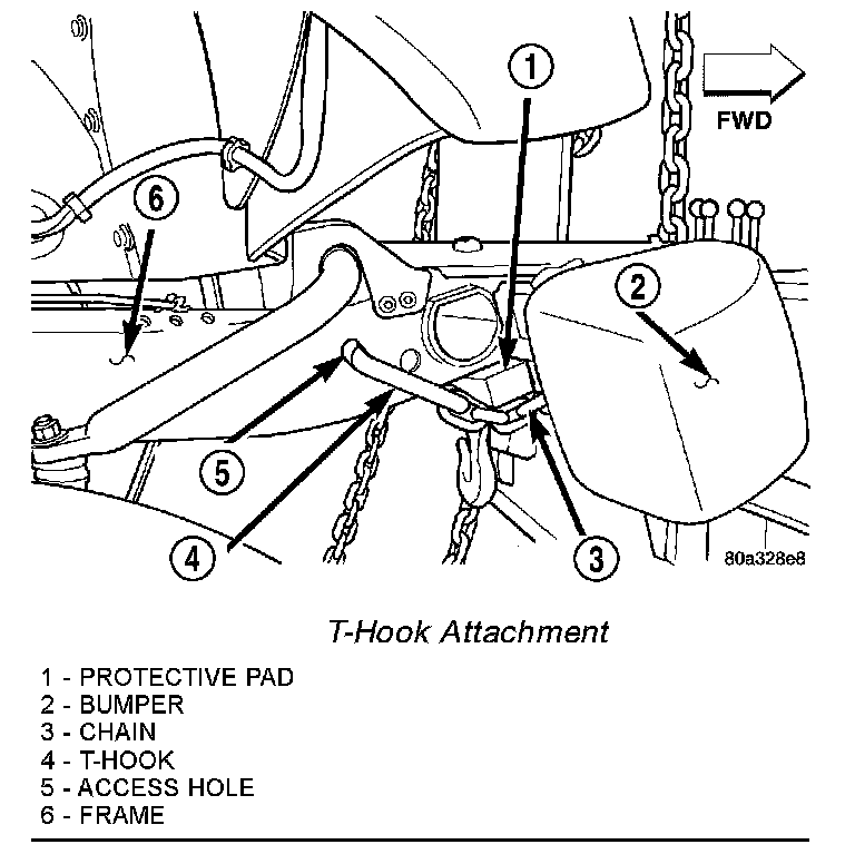 - Do not attach tow chains, T-hooks, J-hooks, or a tow sling to a bumper, steering linkage, drive shafts or a non-reinforced frame hole.