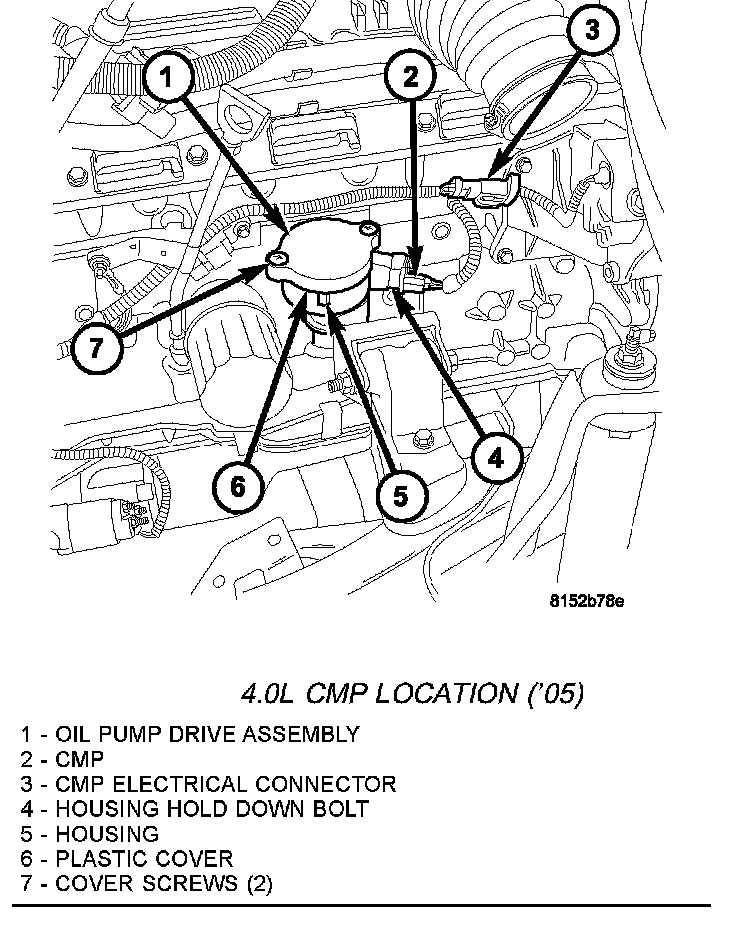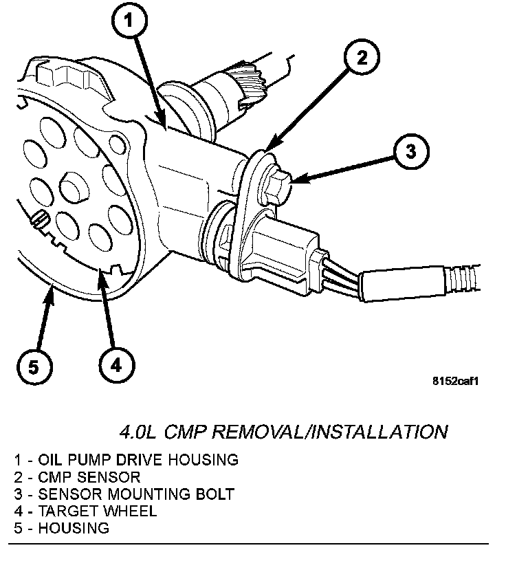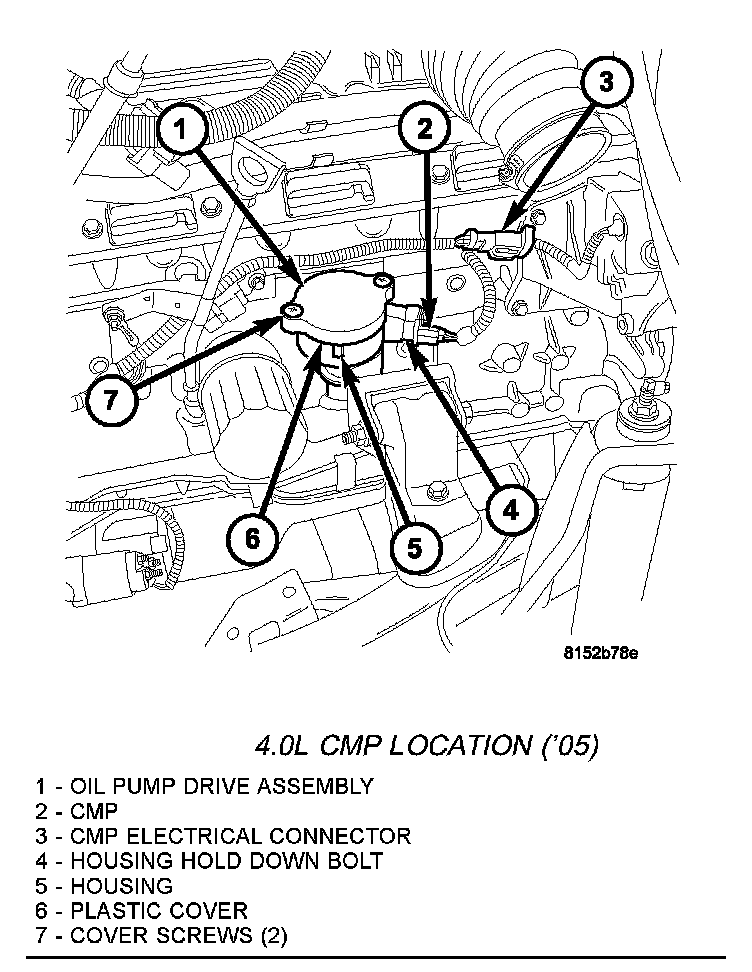 The Camshaft Position Sensor (CMP) on the 4.0L 6-cylinder engine (2) is bolted to the side of the oil pump drive shaft housing assembly (5).