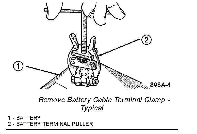 3. Disconnect the battery negative cable terminal clamp from the battery negative terminal post. If necessary, use a battery terminal puller to remove the terminal clamp from the battery post.