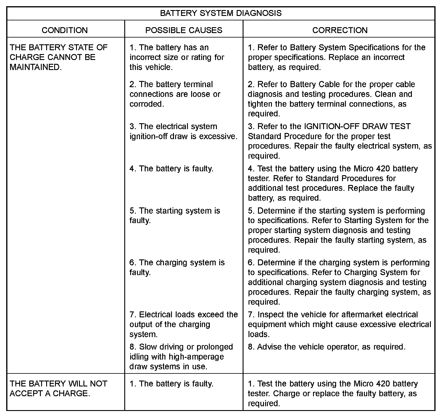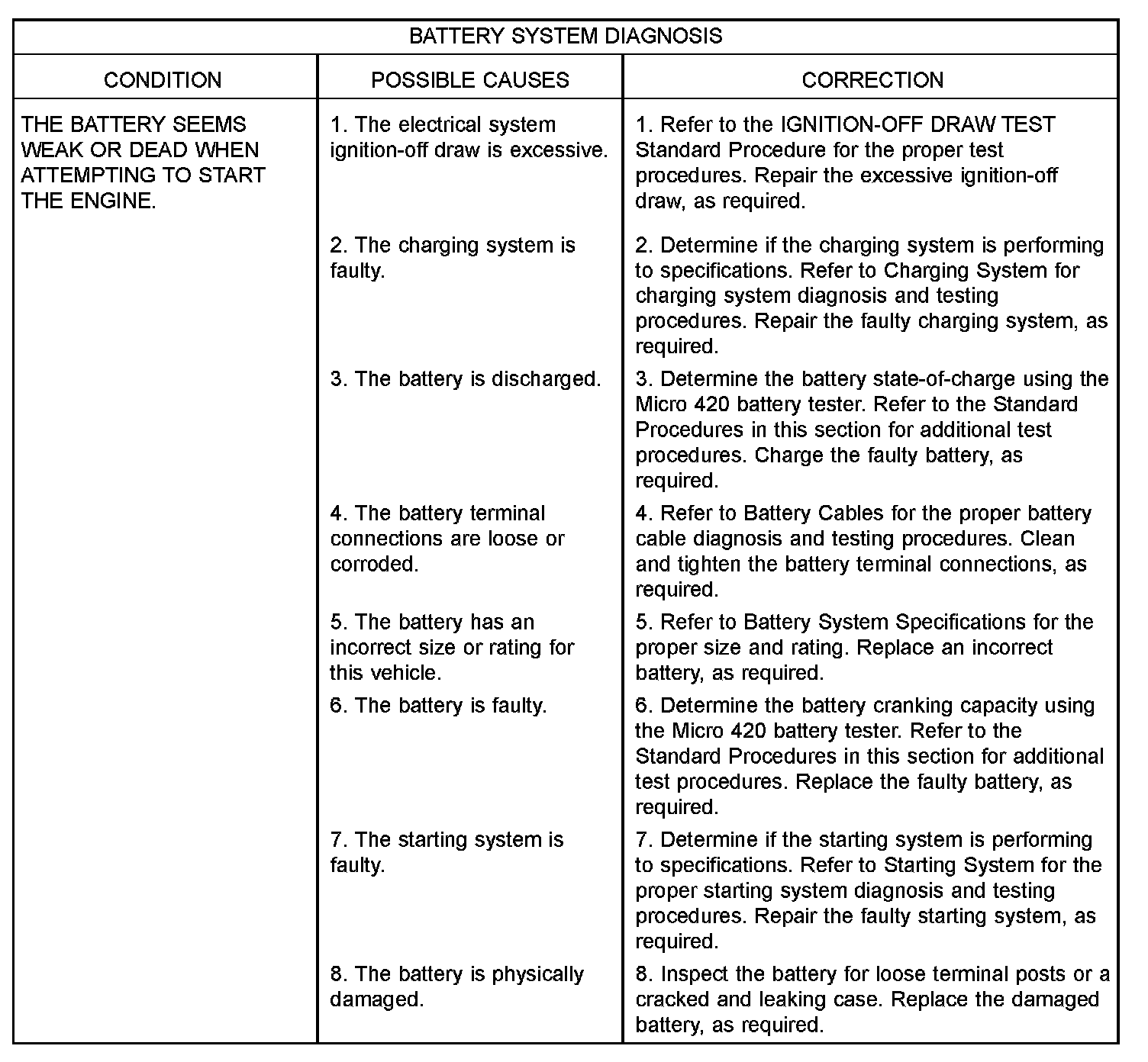 2. A faulty or incorrect battery. Use Micro 420 battery tester and refer to Battery System for additional battery diagnosis and testing procedures.