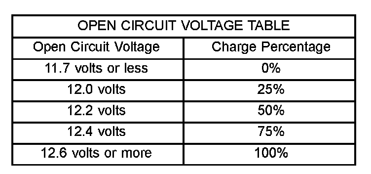 See the Open-Circuit Voltage Table. This voltage reading will indicate the battery state-of-charge, but will not reveal its cranking capacity. If a battery has an open-circuit voltage reading of 12.4 volts or greater, it may be load tested to reveal its cranking capacity.
