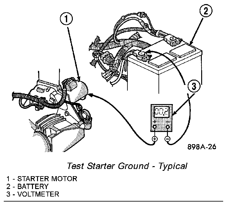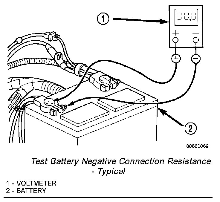 1. Connect the positive lead of the voltmeter to the battery negative terminal post. Connect the negative lead of the voltmeter to the battery negative cable terminal clamp. Rotate and hold the ignition switch in the Start position. Observe the voltmeter. If voltage is detected, correct the poor contact between the battery negative cable terminal clamp and the battery negative terminal post.