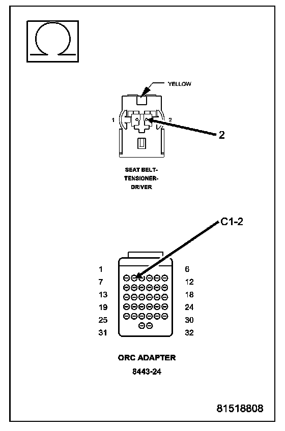 Measure the resistance of the (R55) Driver Seat Belt Tensioner Line 1 circuit between the Driver Seat Belt Tensioner connector and the 8443 ORC Adaptor.
