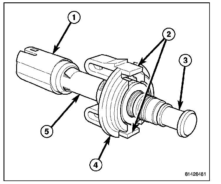 The switch plunger (3) extends through a mounting collar (4) and sleeve on the upper end of the switch body. The sleeve has a one-time, self-adjustment feature that is activated after the switch is installed by closing the hood. Two integral latches (2) lock the switch into a keyed mounting hole in the stamped steel switch mounting bracket. The mounting bracket is secured with screws to the left inner fender shield near the fender ledge in the engine compartment. The underside of the hood panel inner reinforcement actuates the switch plunger as the hood panel is closed.