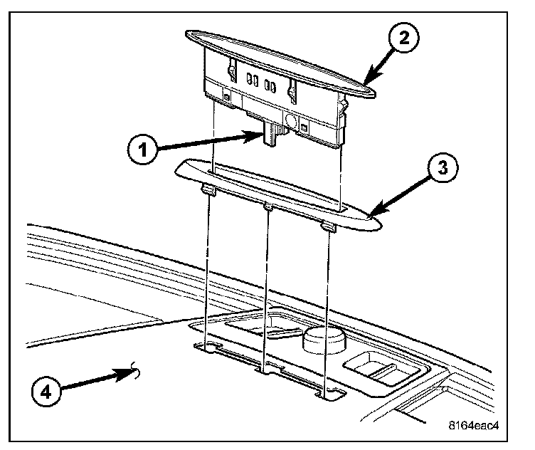 3. Position the escutcheon and the display to the opening in the instrument panel top pad (4) as a unit to access and reconnect the instrument panel wire harness connector to the connector receptacle (1) on the bottom of the display housing.