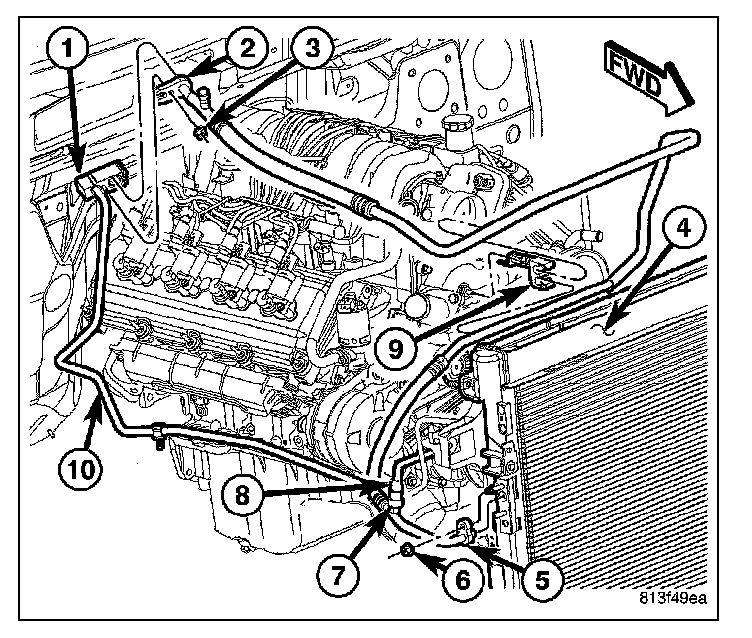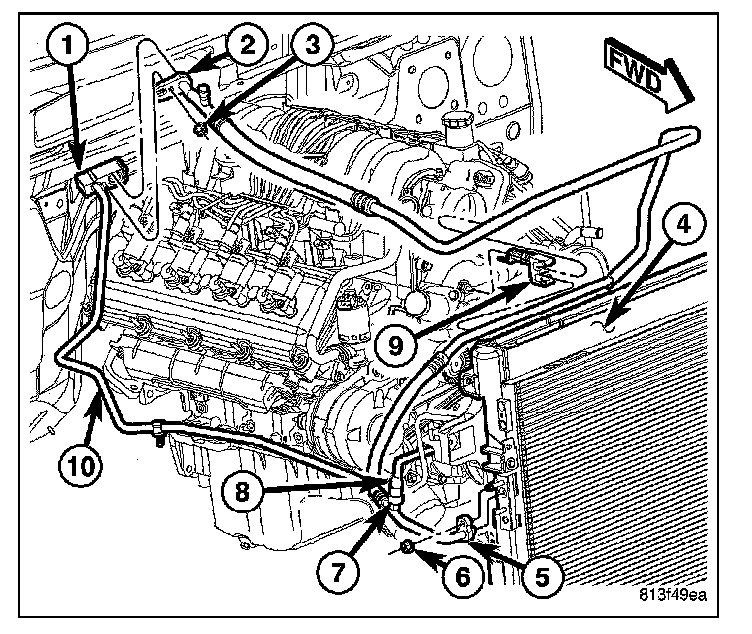 4. Remove the nut (3) that secures the A/C suction line (2) and the A/C liquid line (10) to the A/C expansion valve (1).