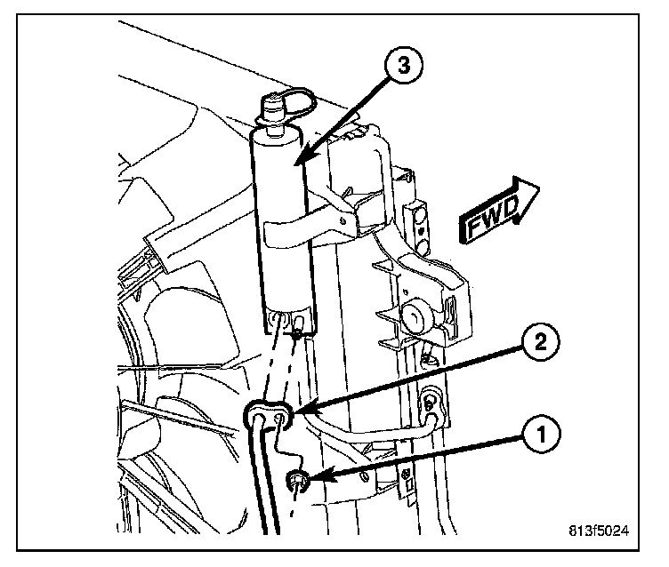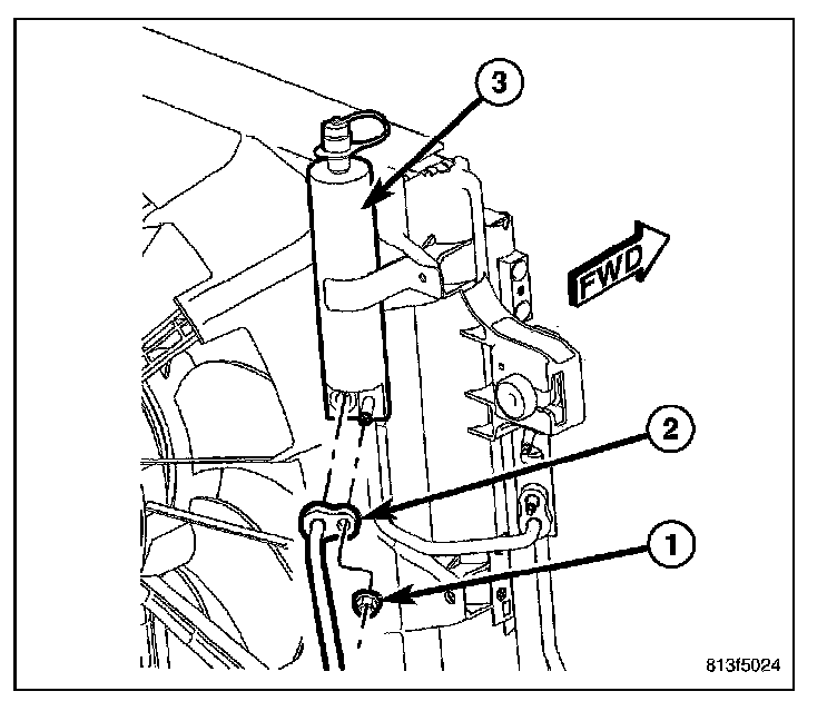 6. Remove the nut (1) that secures the A/C liquid line (2) to the receiver/drier (3).