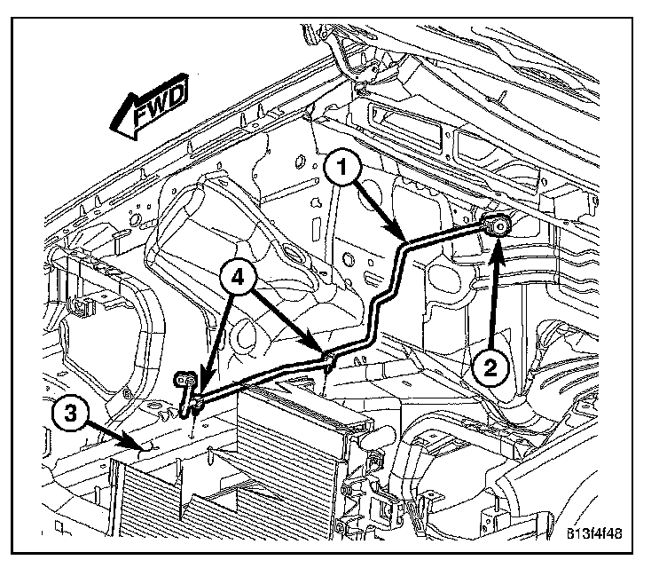 4. Connect the A/C liquid line to the A/C expansion valve (2) and engage the two liquid line retainer clips (4) to the frame rail (3).