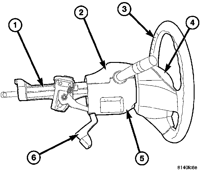 The tilt column has been designed to be serviced as an assembly, less the wiring, switches, shrouds (2 & 5), steering wheel (3), airbag (4) etc. Most steering column components can be serviced without removing the steering column (1) from the vehicle.