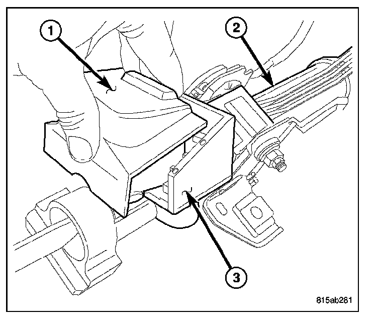 2. Align the engagement and slide tabs integral to the housing of the shaft lock module (1) with the slots and channels in the mounting bracket (3) on the steering column (2).