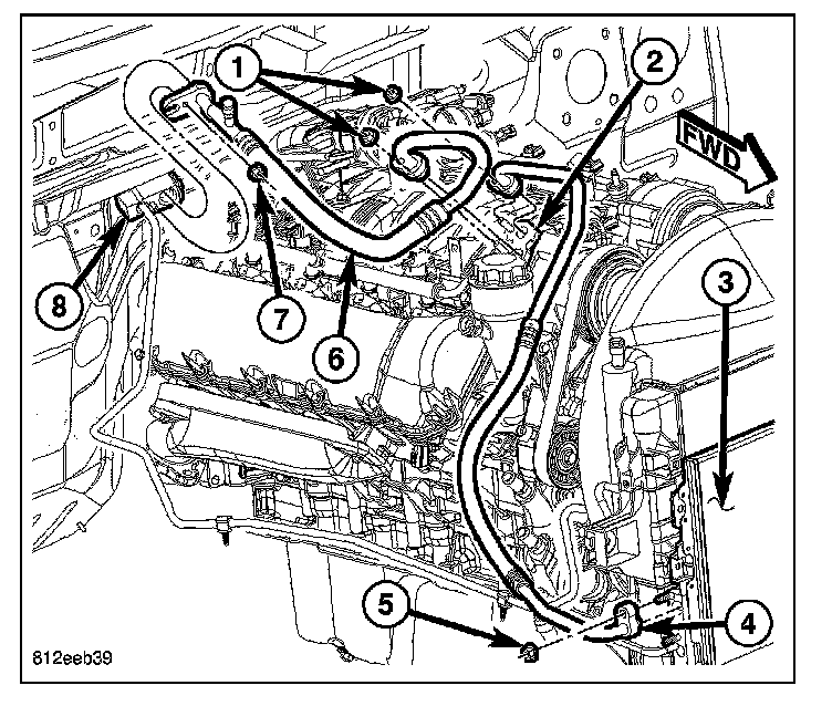 6. Remove the nut (7) that secures the A/C suction line to the A/C expansion valve (8).