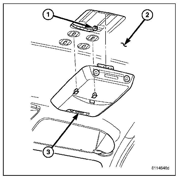 3. Using a trim stick, press the retaining clip at the rear of the monitor (3). Move the monitor from side to side to release from headliner (2).