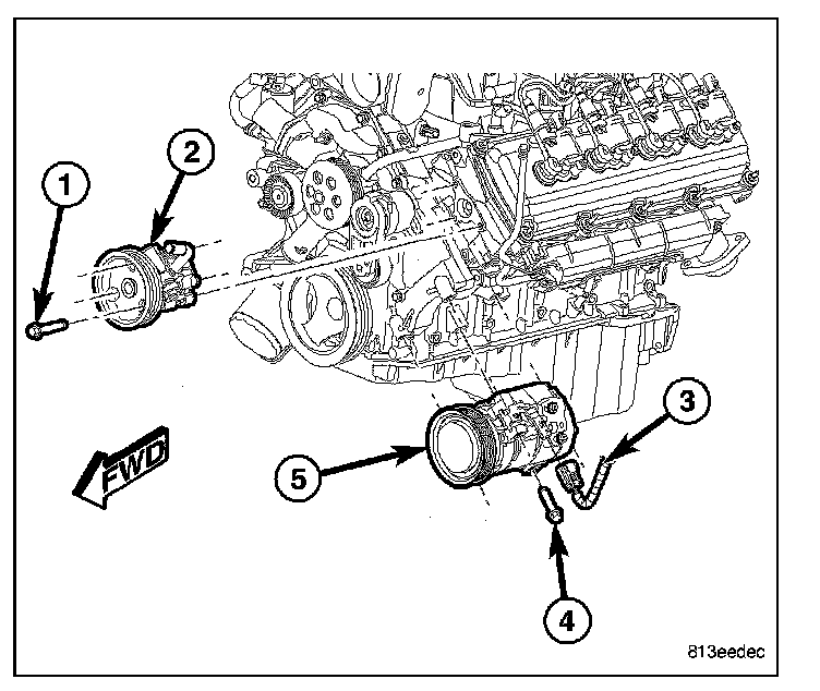 8. Remove the three bolts (1) that secure the power steering pump (2) to the engine and position the pump out of the way.