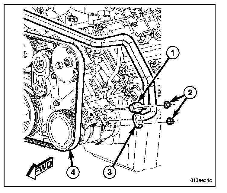 2. Install the bolts (4) that secure the A/C compressor to the engine. Tighten the bolts to 55 N.m (41 ft. lbs.).