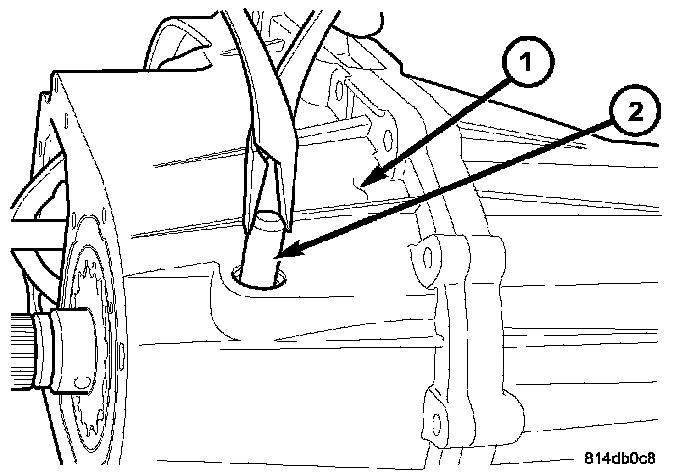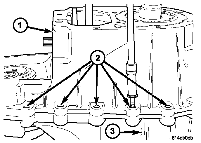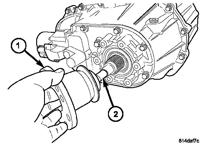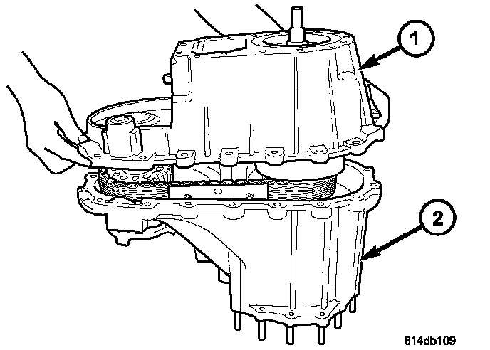 1. Place the transfer case in a shallow pan and remove the fill (1) and drain (2) plugs to drain the remainder of the fluid.