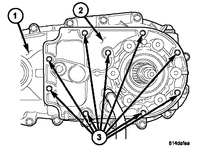 17. Remove the bolts (2) holding the rear housing (1) to the front housing (3).