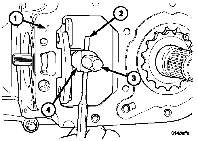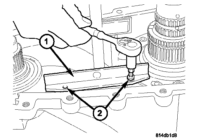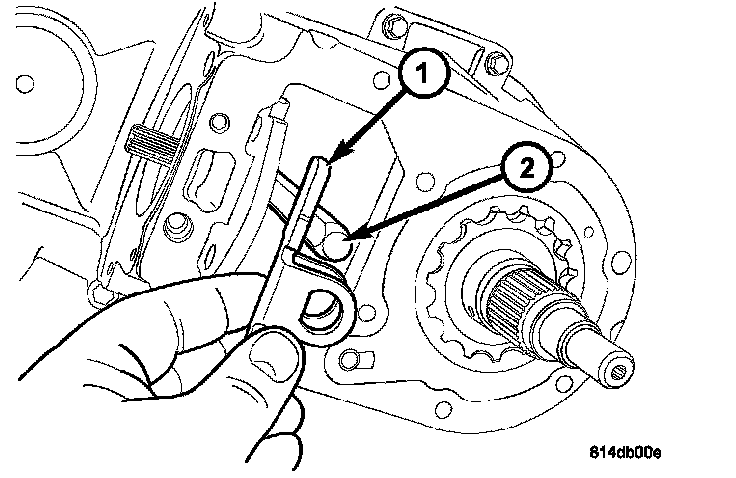 11. Remove the anti-rotation bracket (1) from the shift rail (2).