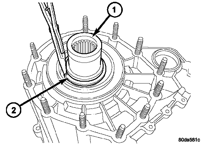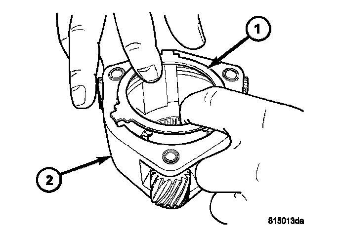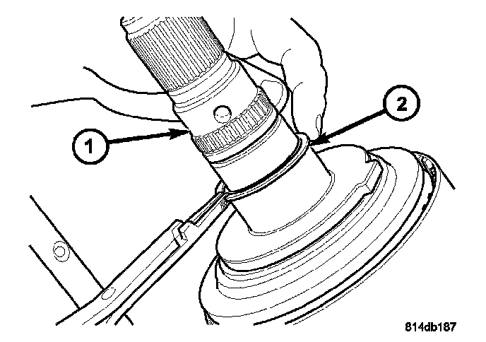 16. Remove the rear output shaft (1) retaining ring (2).