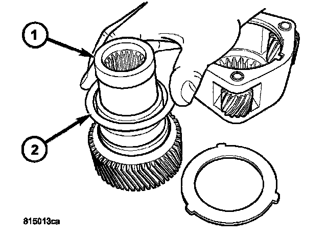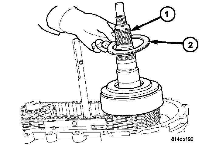 50. Remove the top thrust washer (no tabs) (2) from the input gear (1).