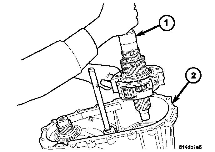 30. Remove the mainshaft and differential assembly (1) from the front housing (2).
