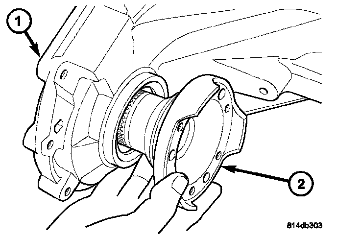 3. Remove the rear output flange (1) from the main shaft (2). If necessary, use a suitable 2 or 3 jaw puller to remove the output flange.