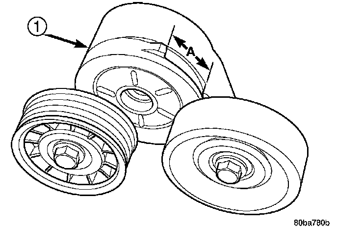 3. With the drive belt installed, inspect the belt wear indicator. On 3.7L Engines the gap between the tang and the housing stop (measurement A) must not exceed 24 mm (0.94 inches).