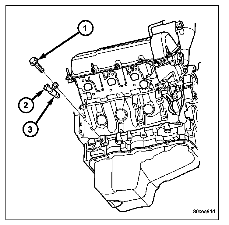 The Crankshaft Position (CKP) sensor (2) is mounted into the right rear side of the cylinder block. It is positioned and bolted into a machined hole.