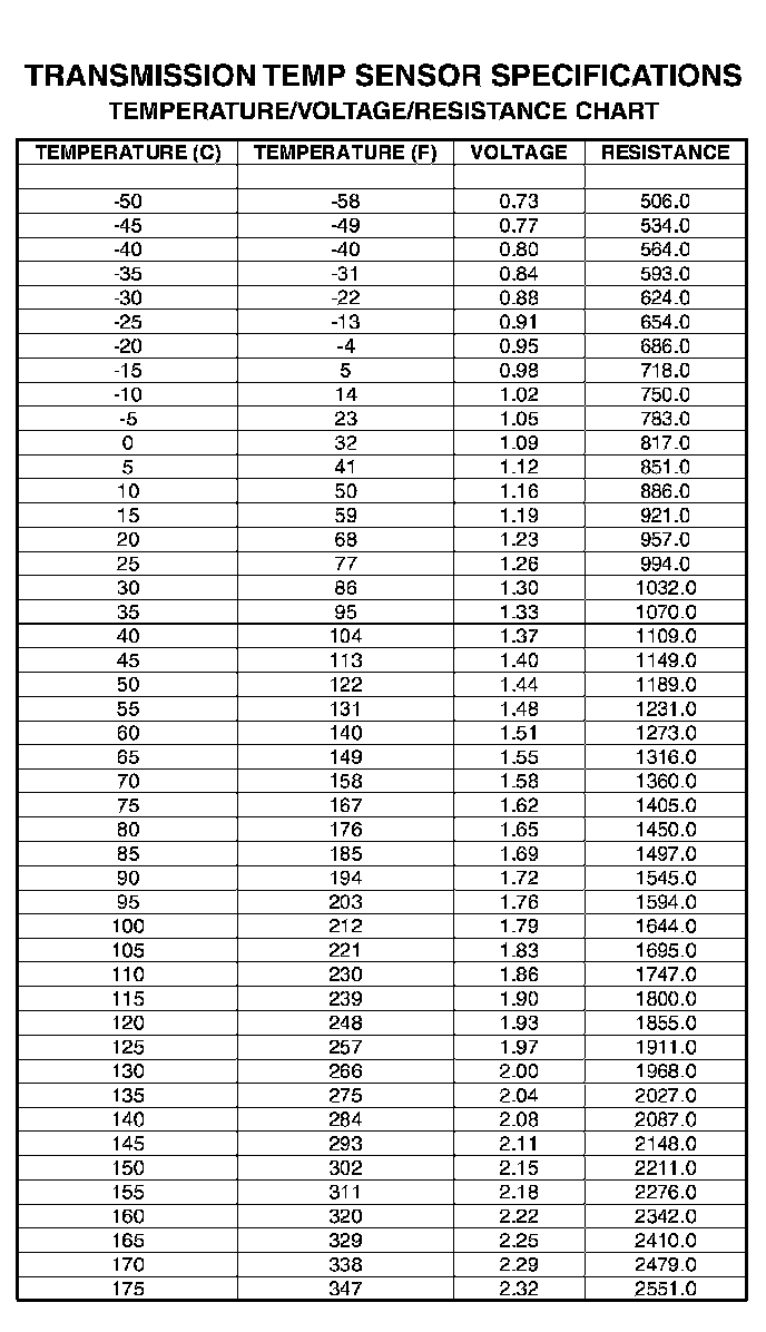 Refer to the Transmission Temperature Sensor Specifications table for the relationship between transmission temperature, sensor voltage, and sensor resistance.