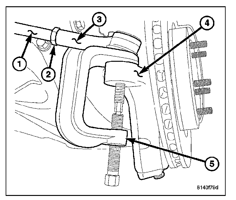 5. Separate the outer tie rod end (3) from the knuckle with puller tool #8677 (5).