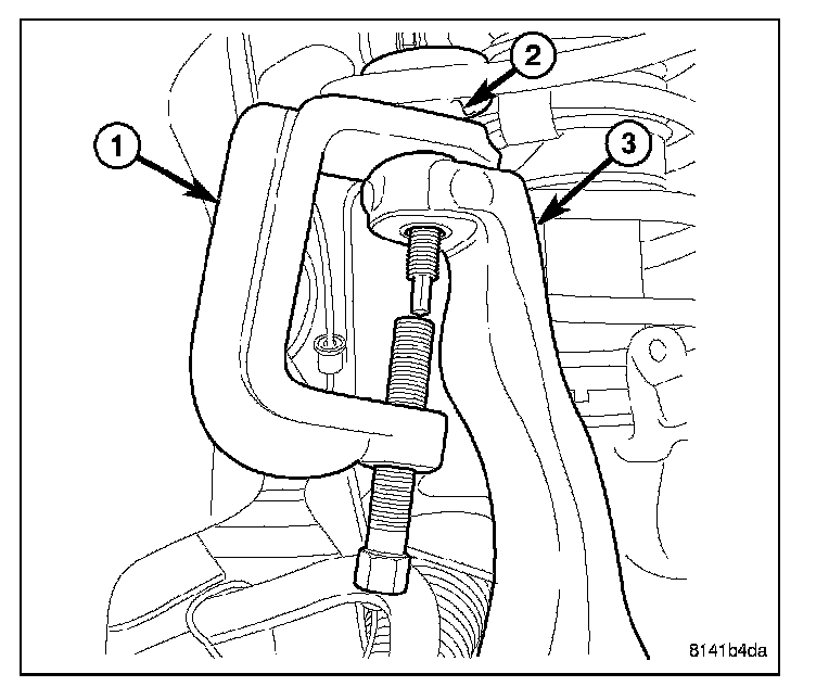 7. Separate the upper ball joint (2) from the knuckle (3) using puller tool #8677 (1).