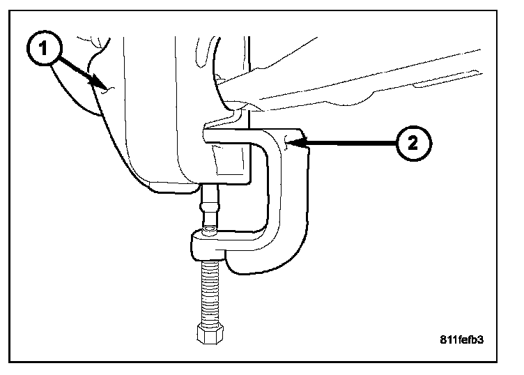 11. Separate the lower ball joint from the knuckle (1) using puller tool #C-4150A (2).
