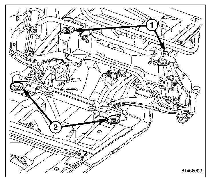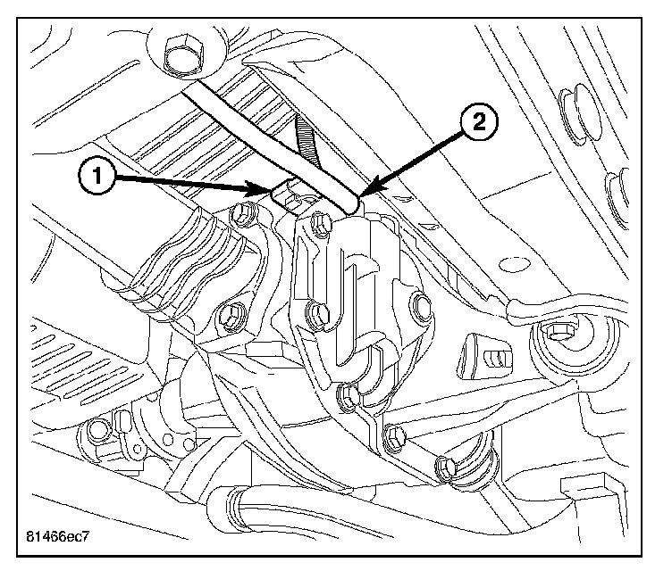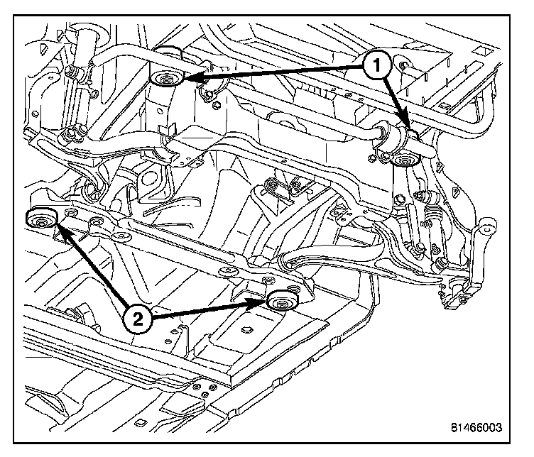 5. Align the engine cradle to the marks made during removal and tighten the front bolts (1) to 203 N.m (150 ft.lbs.).