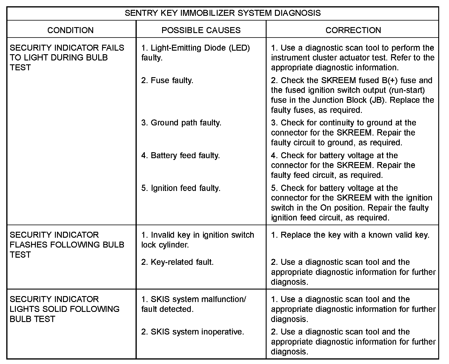 The hard wired Sentry Key Immobilizer System (SKIS) components and circuits may be diagnosed and tested using conventional diagnostic tools and procedures. Refer to the appropriate wiring information. The wiring information includes wiring diagrams, proper wire and connector repair procedures, details of wire harness routing and retention, connector pin-out information and location views for the various wire harness connectors, splices and grounds.