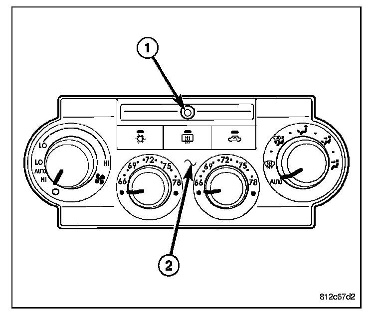 The infrared sensor is used only on models equipped with the automatic temperature control (ATC) heating - A/C system. The infrared temperature sensor consists of a infrared transducer concealed behind a clear lens (1) located within the instrument panel mounted A/Cheater control (2).