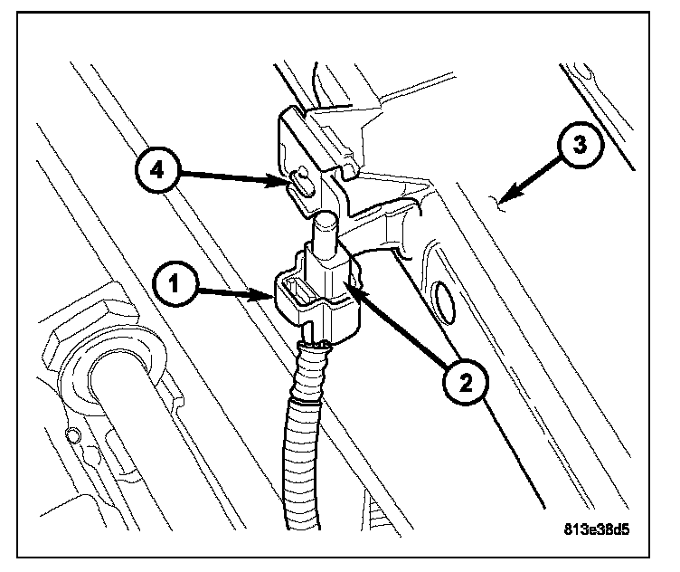1. Install the ambient air temperature sensor (2) onto the top of the front bumper beam (3). Make sure that the retaining tabs (4) are fully engaged.